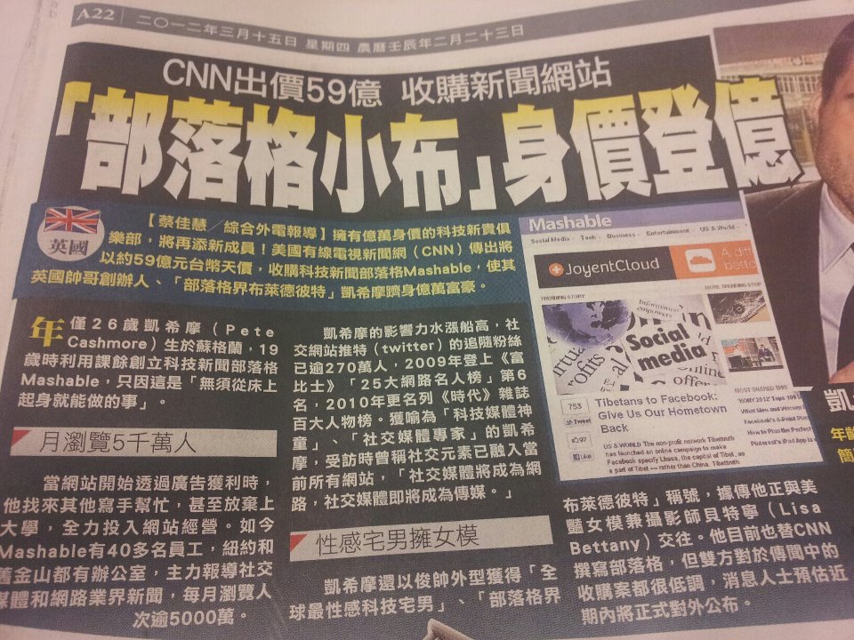 .2012年美國有線電視新聞網傳有意收購.Mashable,金額達59億元台幣